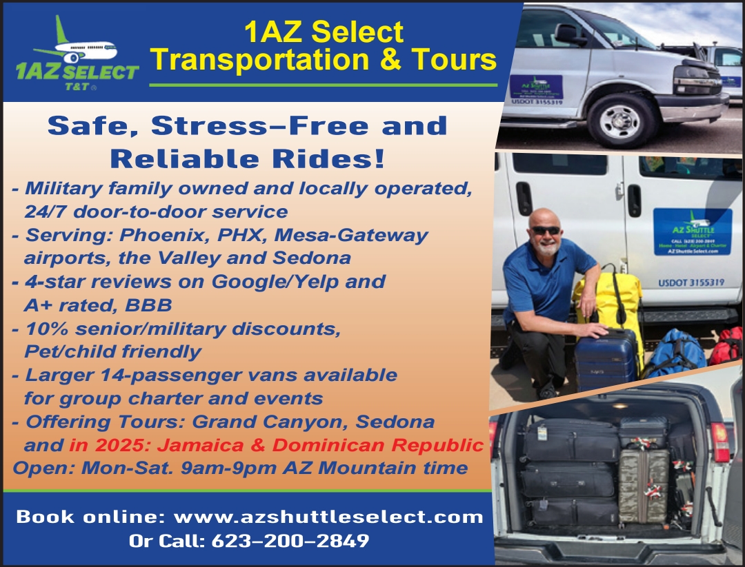 Welcome to 1AZ Select Transportation & Tours, your premier airport & local transportation & scenic tours company in Phoenix, AZ. We are a small military family-owned and locally operated business that has earned 4-star reviews on Google and Yelp and is slowly growing on the BBB platform with an A+ rating for excellent customer service, reliability, and stress-free transportation in the area. We offer ride-share, nonstop express, and group transportation for airport or other general transportation needs.